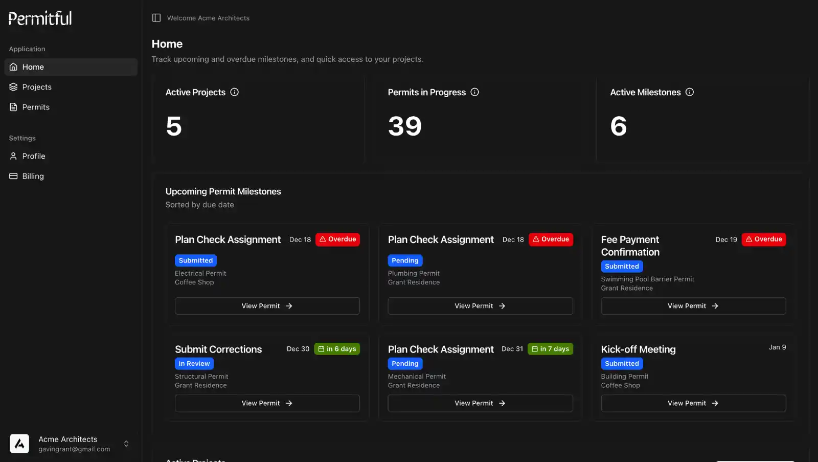We've added a new section to home dashboard of the Permitful app with key analytics for your projects and permits. The new section shows you the number of active projects, permits in progress, and active milestones in your account.