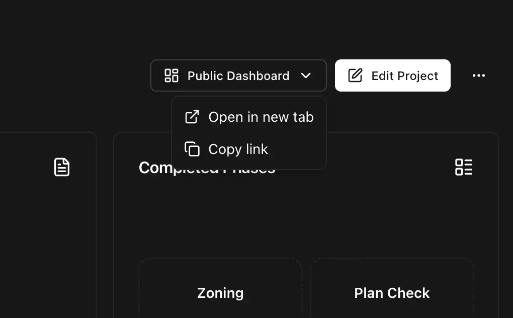 - Open in new tab — Open the public project dashboard in a new browser tab.